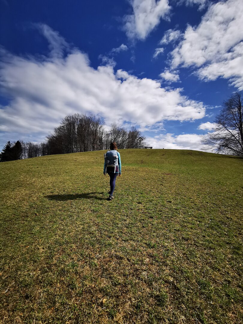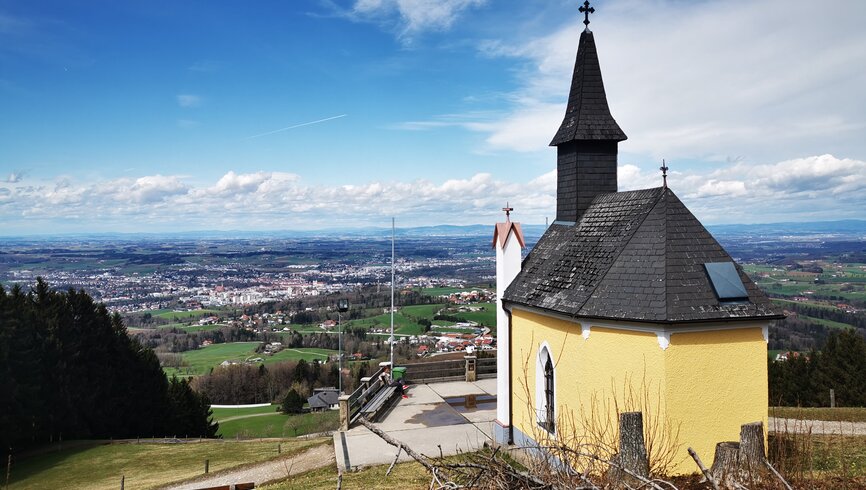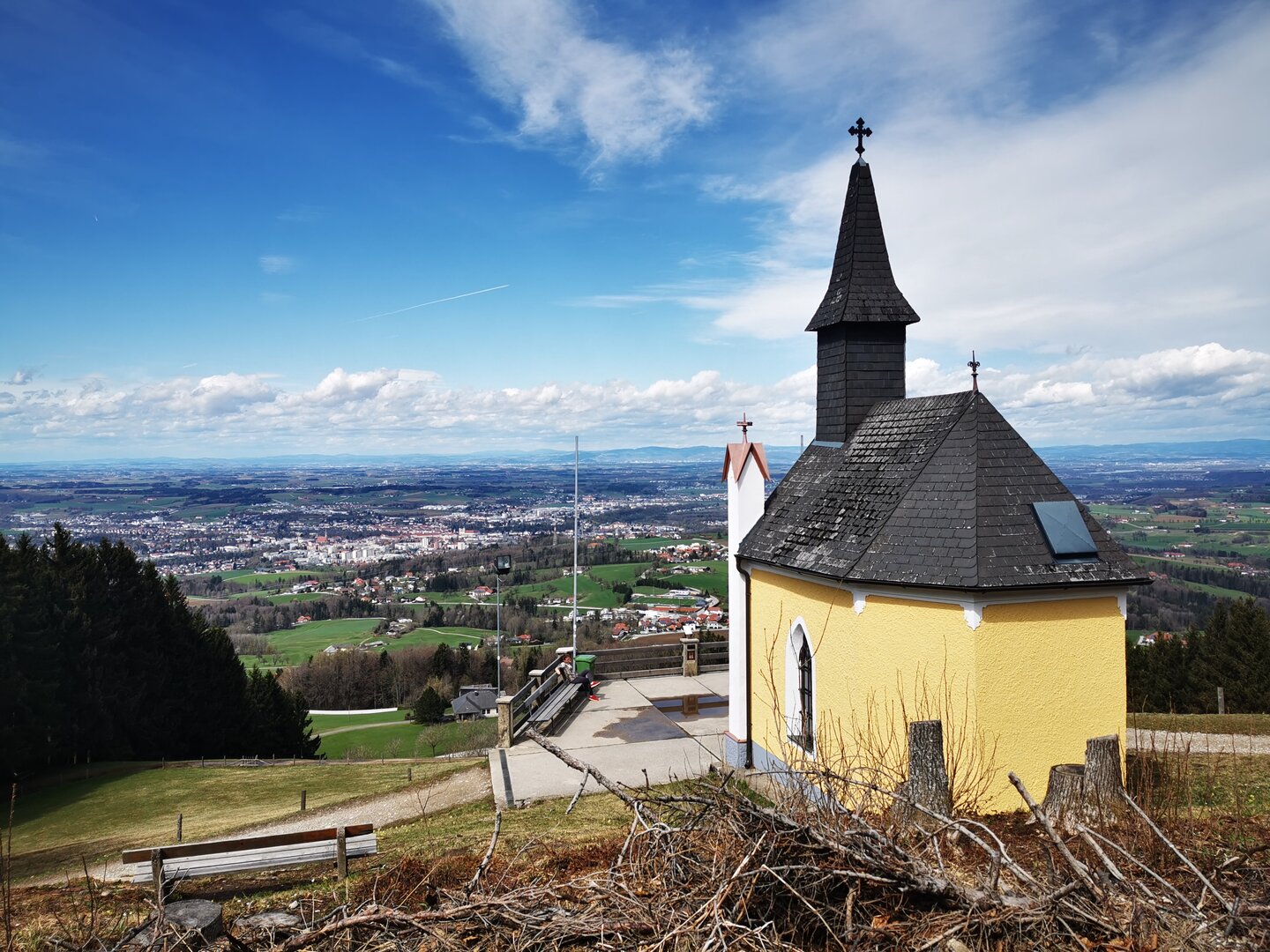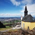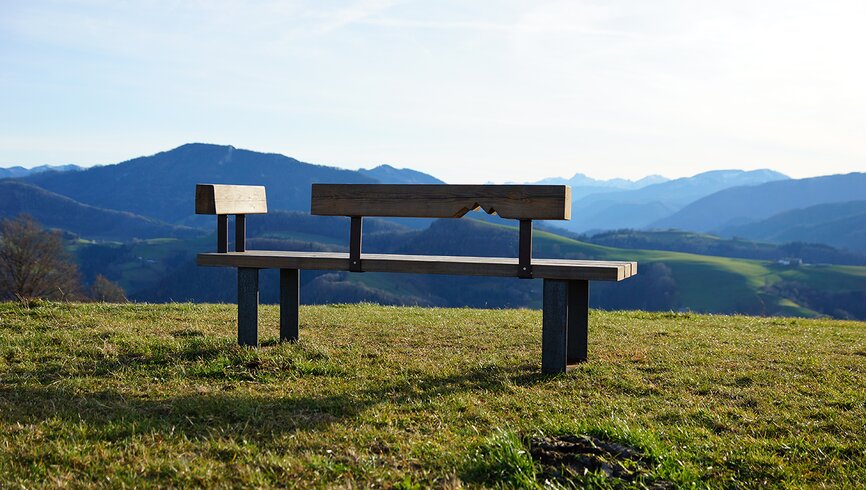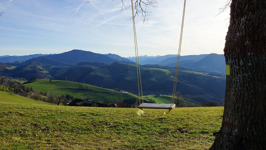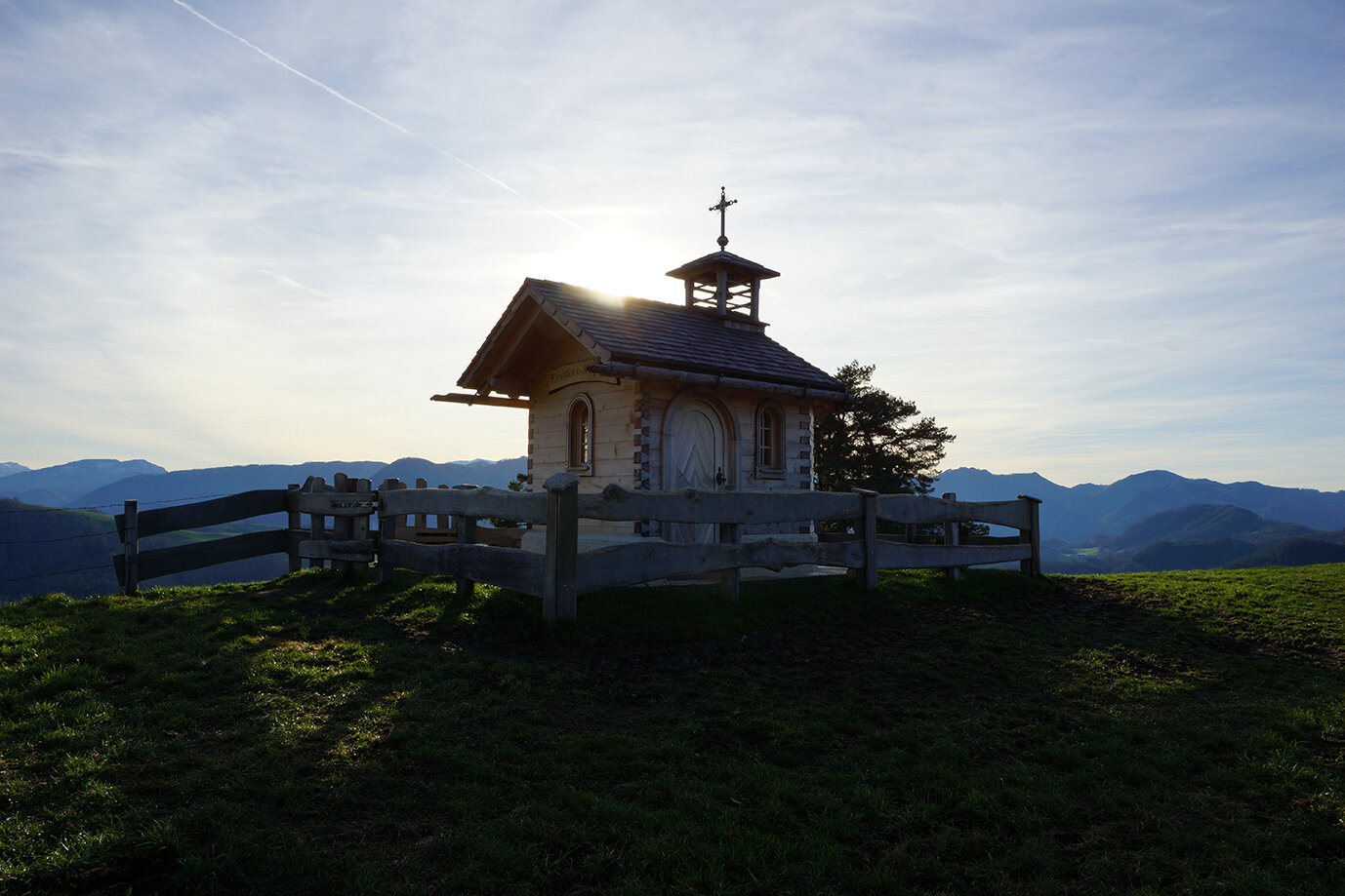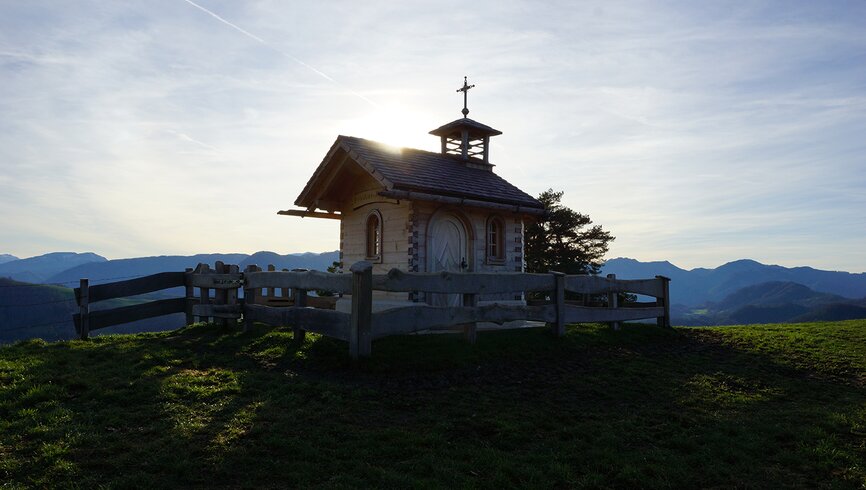 Gestärkt geht's weiter zum Sonnberg, einem wunderschönen Wiesenrücken. Abermals parken wir unsere Räder und wandern in etwa 15 Minuten zum höchsten Punkt unseres dritten Ausflugs-Highlights. Hier begeistern eine wunderschöne kleine Holzkapelle, gemütliche Sitzmöglichkeiten und die „Himmelsschaukel“ und laden zum Verweilen ein.