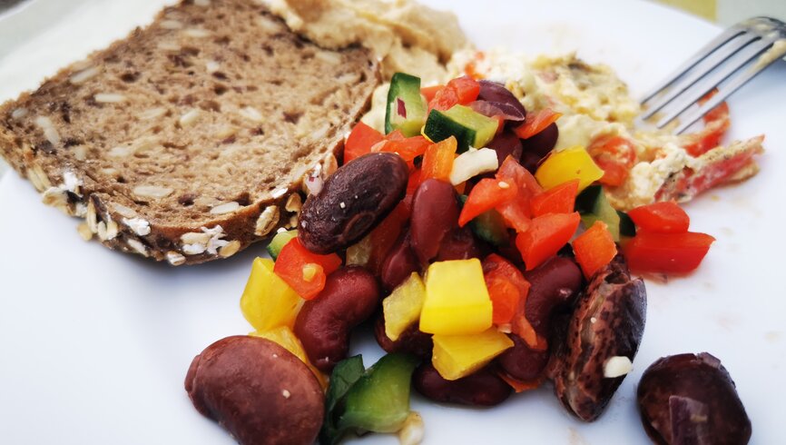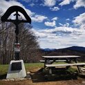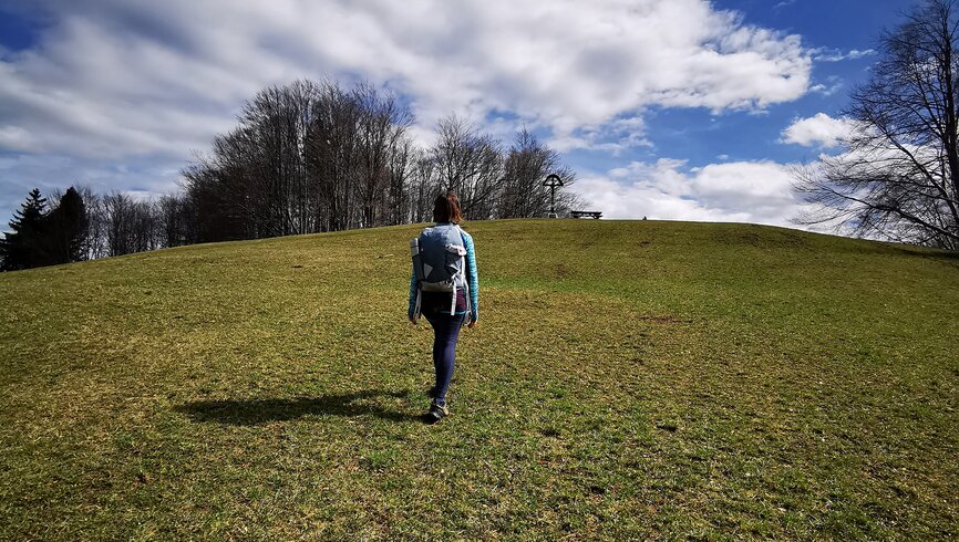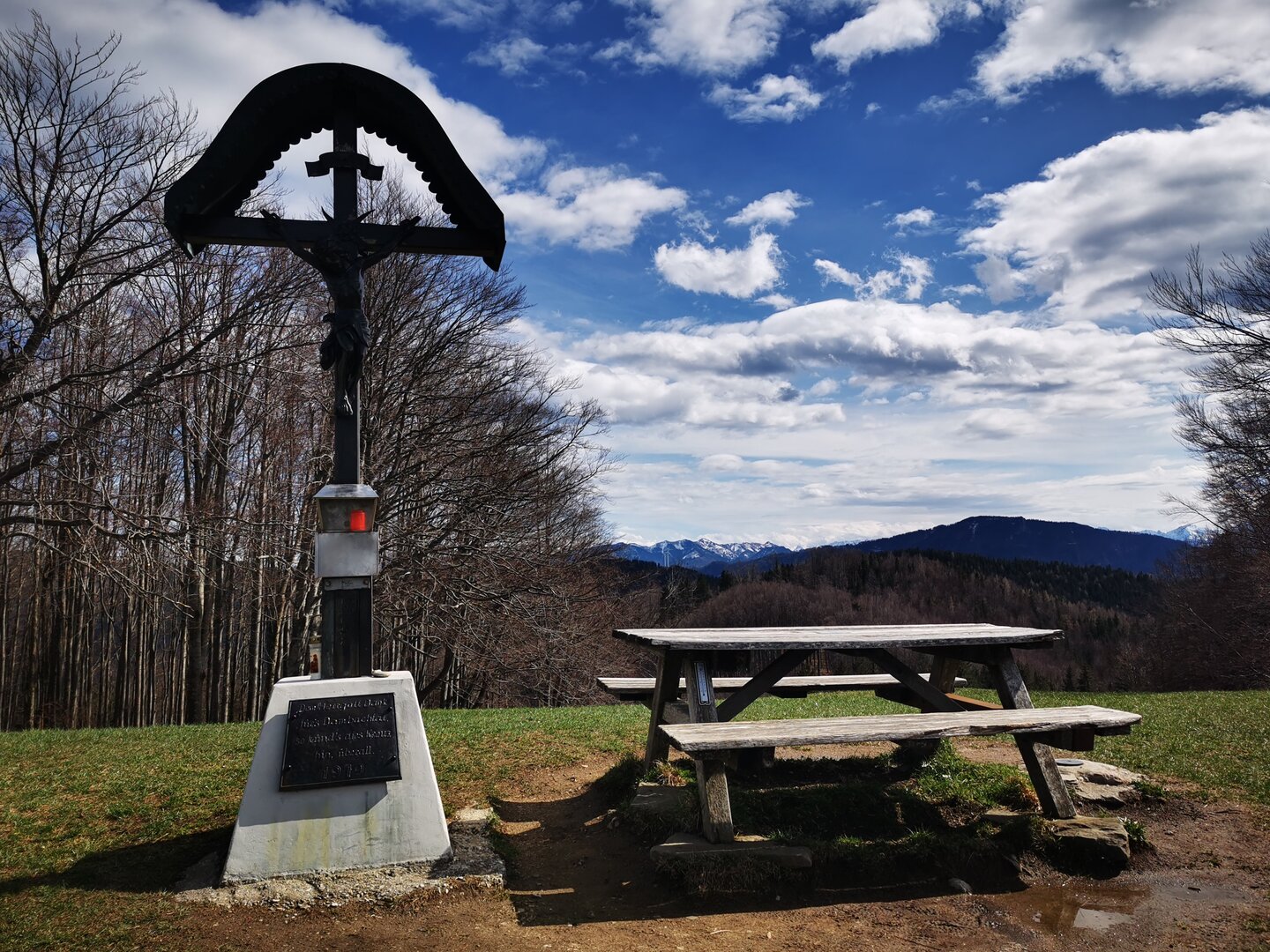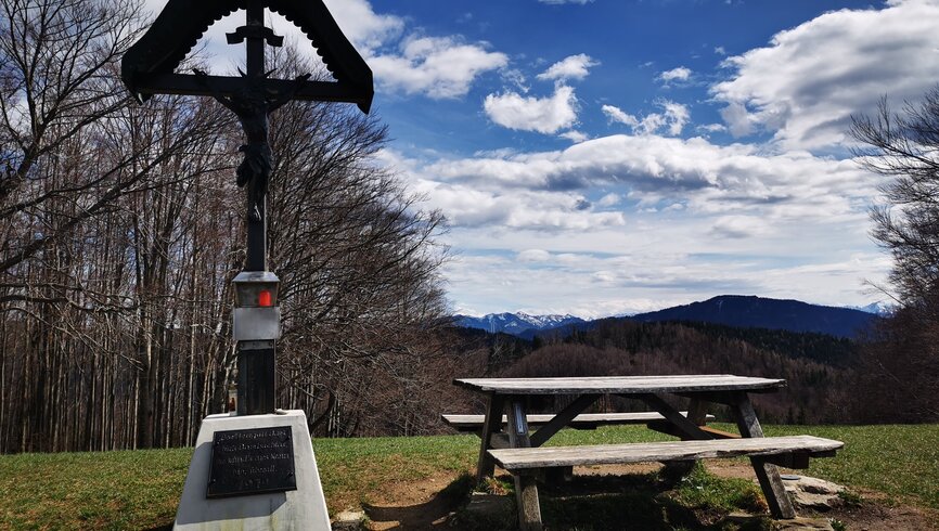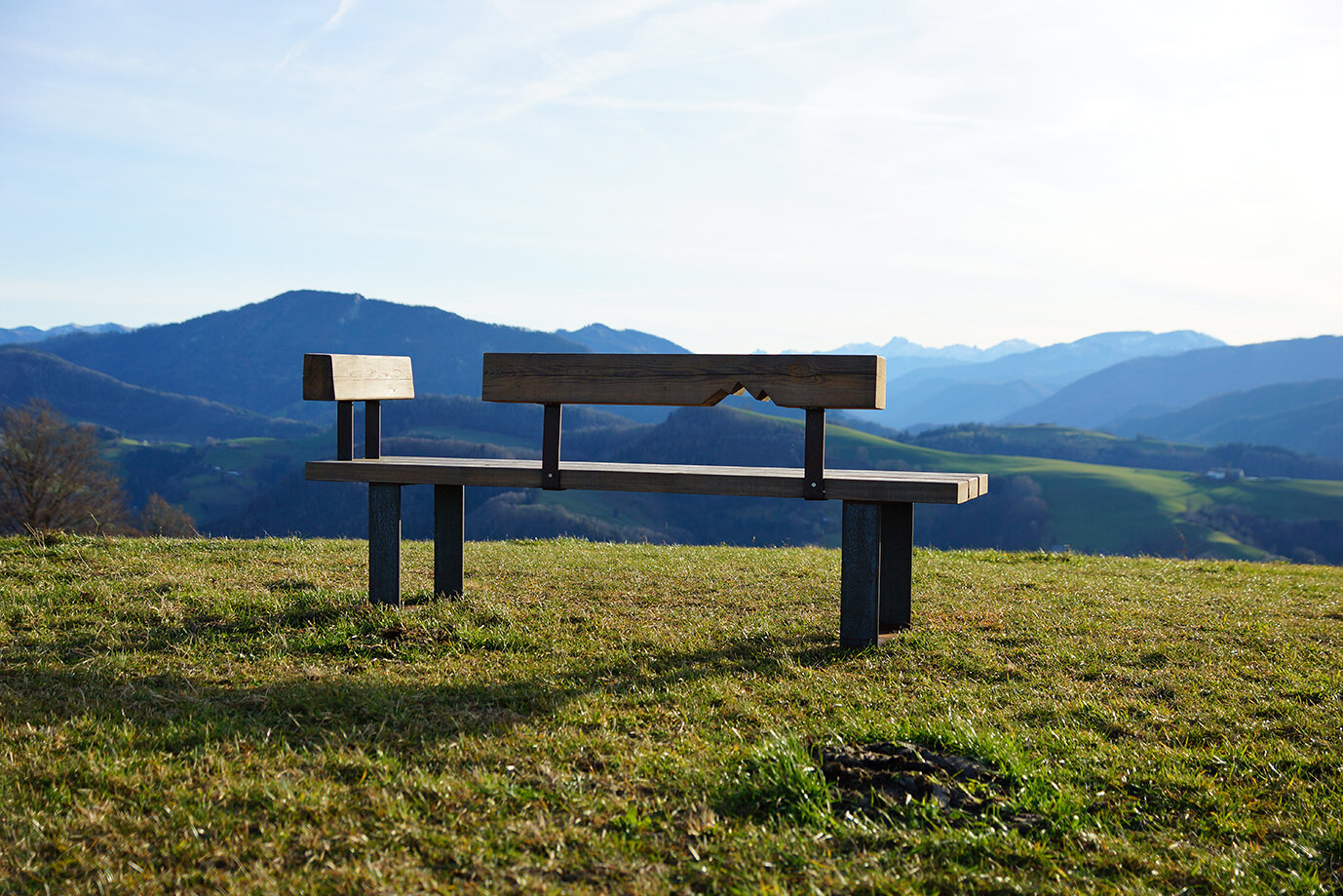 Wir setzen unsere Tour in südlicher Richtung zum Schwarzberg fort. Etwa 100 Höhenmeter unter dem Gipfel beginnt unsere erste Wander-Etappe. Die Räder beim Wegweiser auf der Forststraße versperrt, marschieren wir den schönen Waldweg bergauf, dann über die saftig grüne Kuppe bis zum Gipfelkreuz. Beim Picknick genießen wir die wohlverdiente Rast.