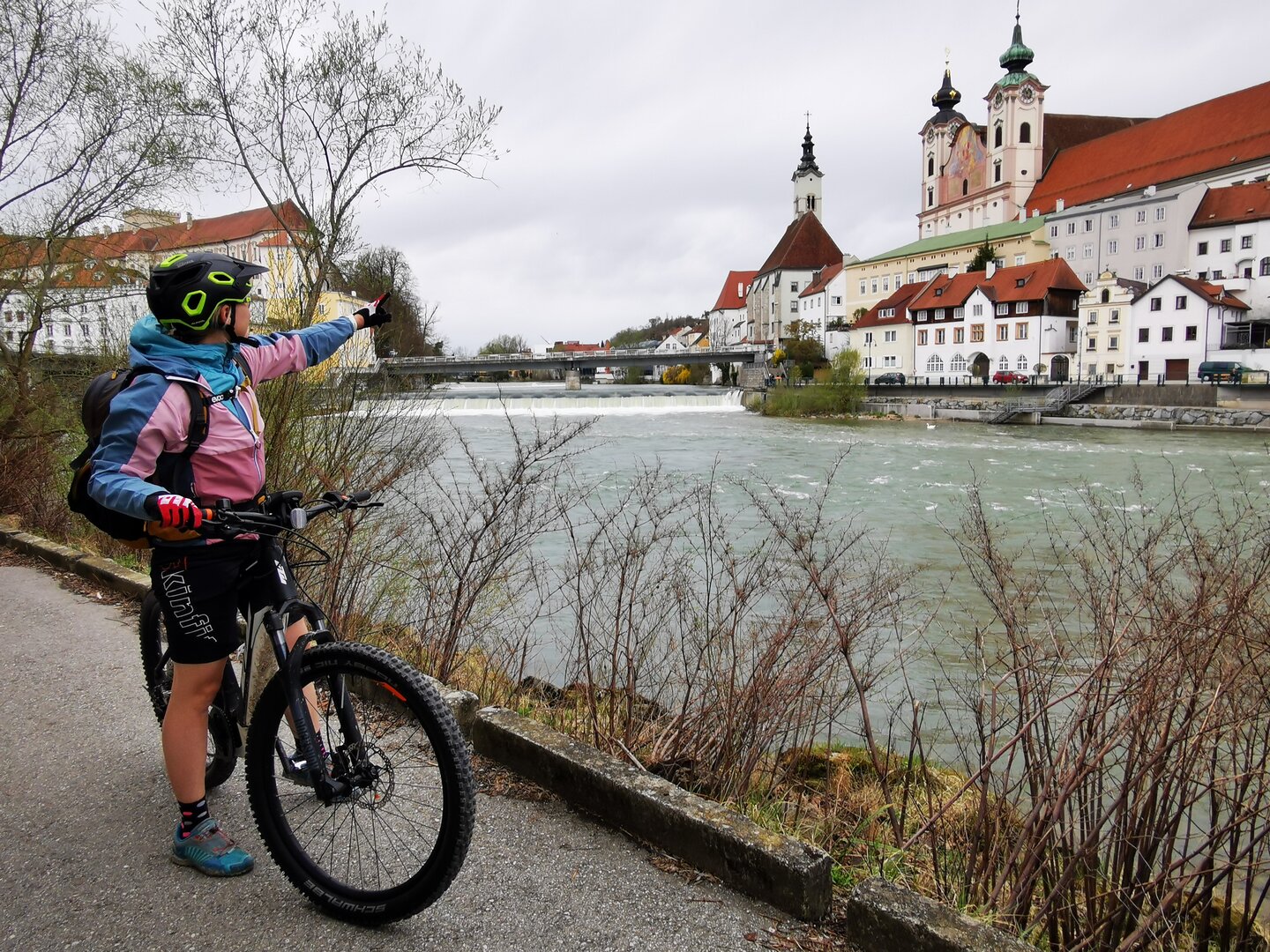 Danach steigern wir unser Tem- po. Rita erklärt die optimale Abfahrtsposition und wircruisen bergab Richtung Dambach. Diesmal bleiben wir auf der östlichen Uferseite der Enns, überqueren diese auf Höhe des Zusammenflusses mit der Steyr und kehren zurück ins Stadtzentrum. Ich bin begeistert von meiner ersten Rad-Wanderung, die mir 40 Kilometer Wegstrecke in wenigen Stunden ermöglicht hat.