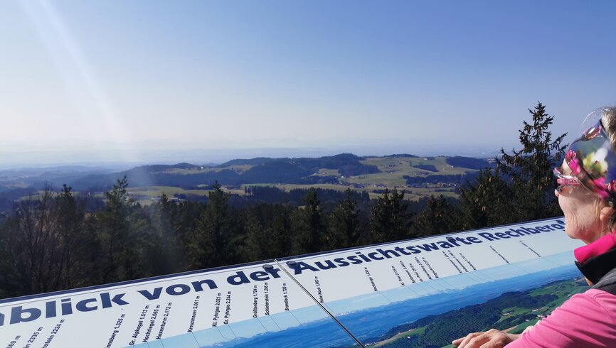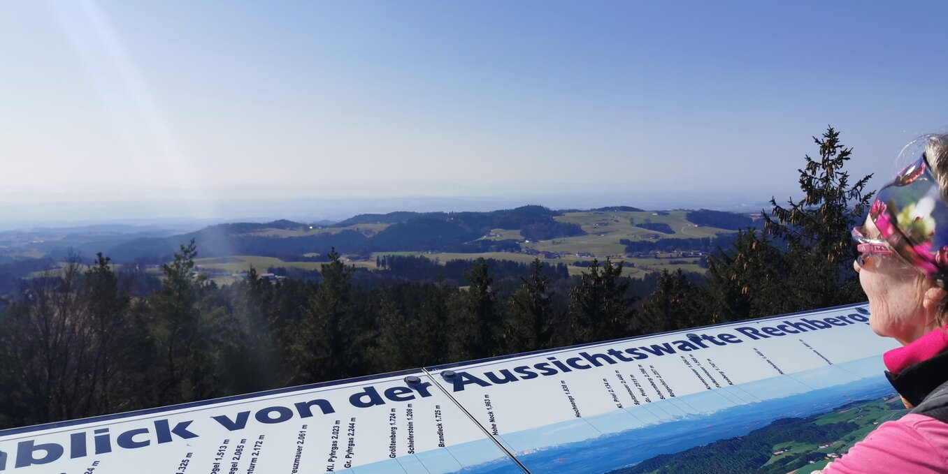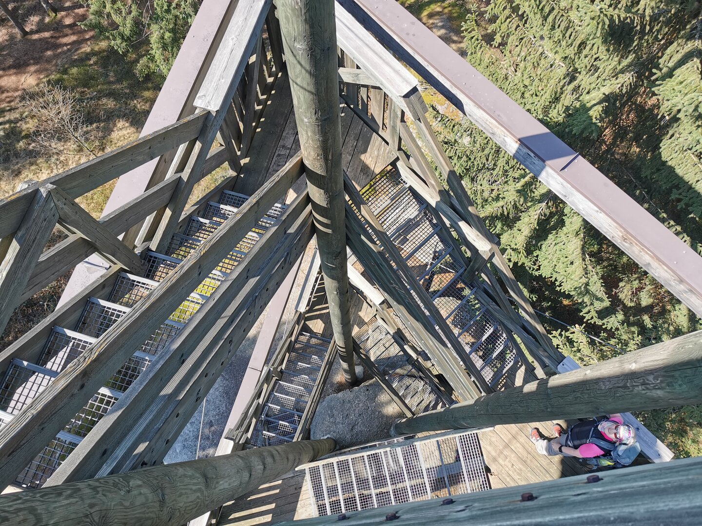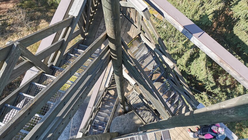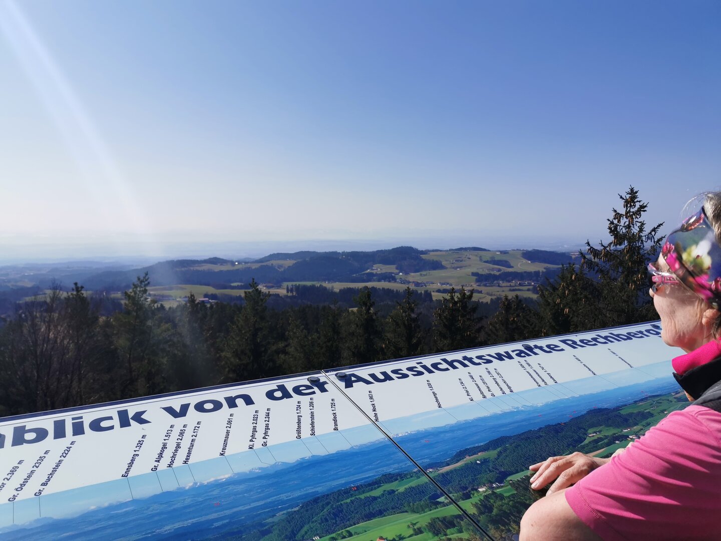 96 Stufen trennen uns von dem heutige etwas diesigen Panoramablick vom Schneeberg im Osten, Gesäuse, den weiß gemalten Bergen der Pyhrn-Priel-Region, gefolgt vom Traunstein und dem Pöstlingberg ganz im Westen. Wir blicken auf bekannte Gipfel und lassen uns zu neuen Bergtouren inspirieren.