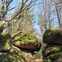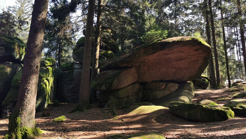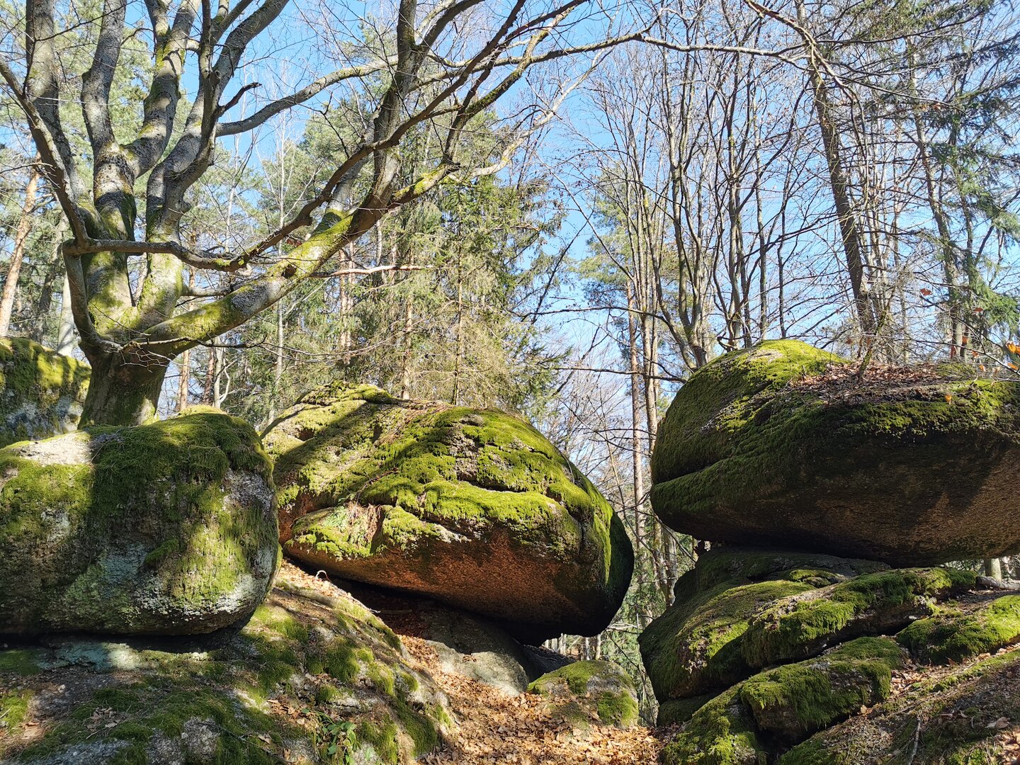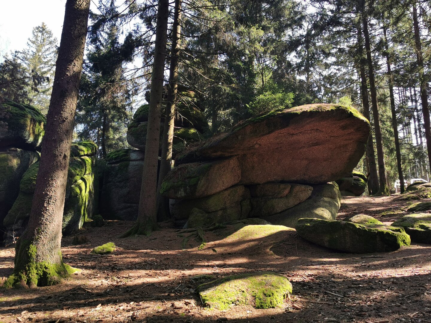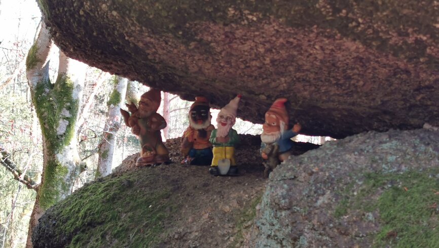 Hier beginnt nun auch der Waldweg, der uns weiter an Höhenmetern gewinnen lässt. Entdeckt ihr die 4 Gartenzwerge im 1. Blockstein-Gebilde? Je nach Motivation nehmen wir den extra Anstieg zum Fuchsbau, einer moosbewachsenen Fels-Formation in Angriff, der das steilste Stück des gesamten Weges darstellt. Oder man umrundet diesen und trifft auf der anderen Seite der Erhebung wieder mit dem Abstiegsweg zusammen.