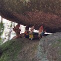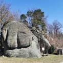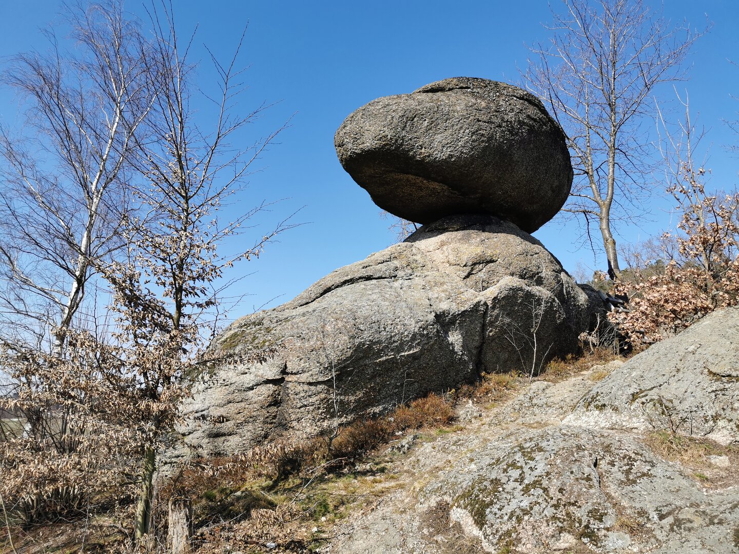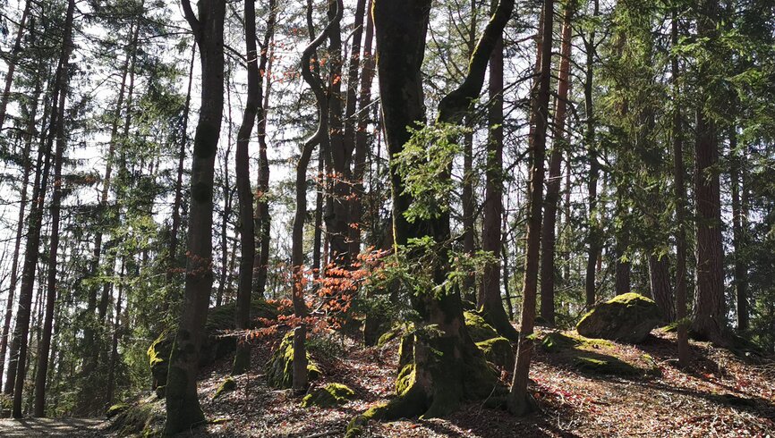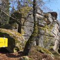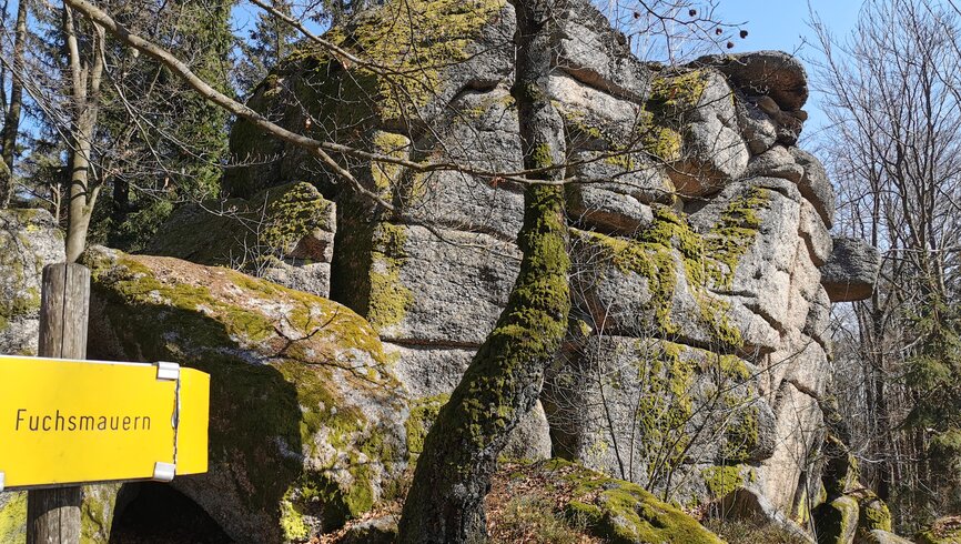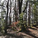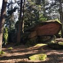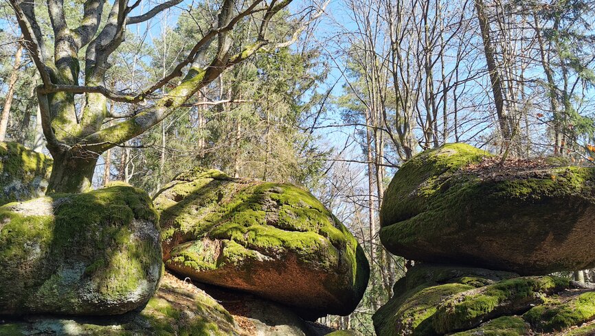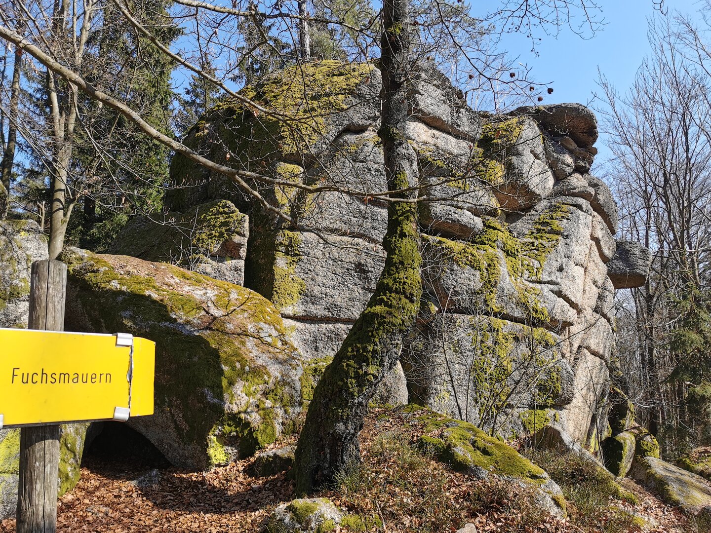Hier beginnt nun auch der Waldweg, der uns weiter an Höhenmetern gewinnen lässt. Entdeckt ihr die 4 Gartenzwerge im 1. Blockstein-Gebilde? Je nach Motivation nehmen wir den extra Anstieg zum Fuchsbau, einer moosbewachsenen Fels-Formation in Angriff, der das steilste Stück des gesamten Weges darstellt. Oder man umrundet diesen und trifft auf der anderen Seite der Erhebung wieder mit dem Abstiegsweg zusammen.