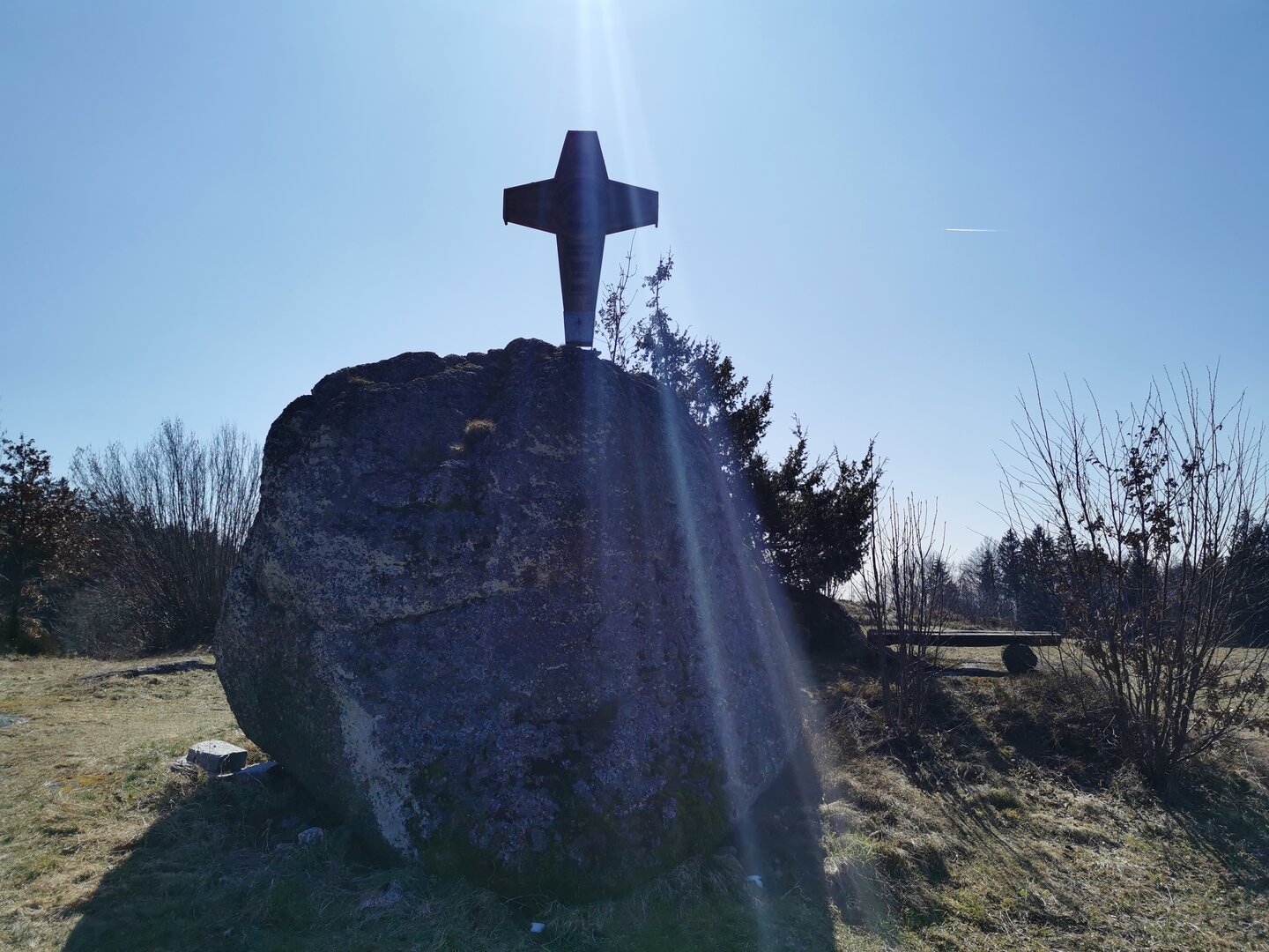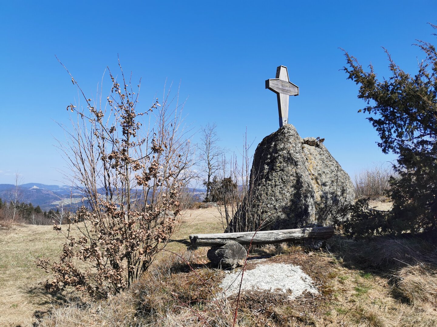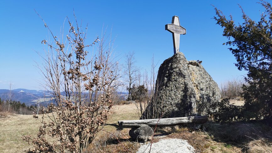 Um den 2. Kraftplatz zu erreichen, geht’s noch mal auf die Straße. Das ist typisch für viele der Mühlviertler (Weit)Wanderwege, dass diese wunderbare Orte kombinieren, aber das Miteinbeziehen von asphaltierten Verbindungsstraßen bedingt. Der Verkehr ist ruhig und wir erreichen entspannt den höchsten Punkt unserer Rundwanderung: die rechts der Straße auf 696m gelegene Pammerhöhe. Ein Holzkreuz ziert die 1990 als Naturdenkmal ausgezeichnete weitläufige Ebene, die wie ein Ufo-Landeplatz anmutet. Hier genießen wir nach ca. der Hälfte der Wegstrecke eine Mittagsrast: großzügig verteilte Bänke aber auch die Steine selbst bieten hier gemütliche und abgeschiedene Möglichkeit zum Erholen.