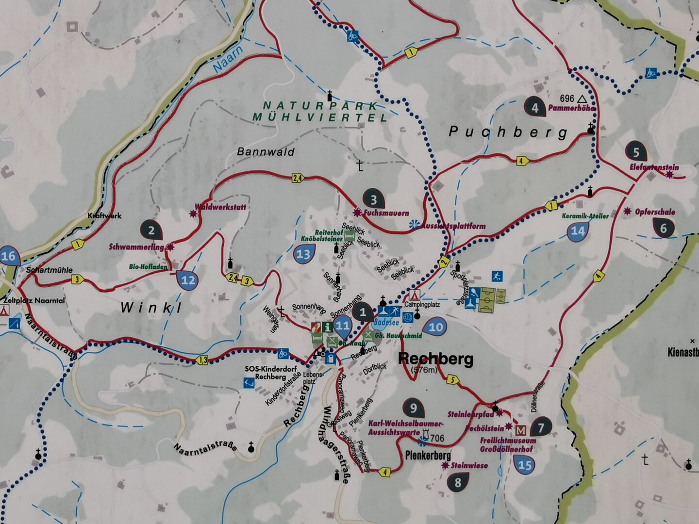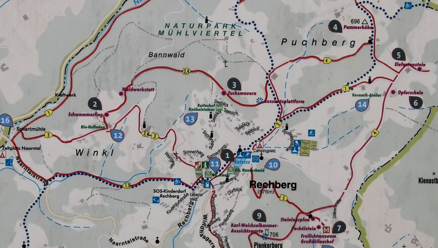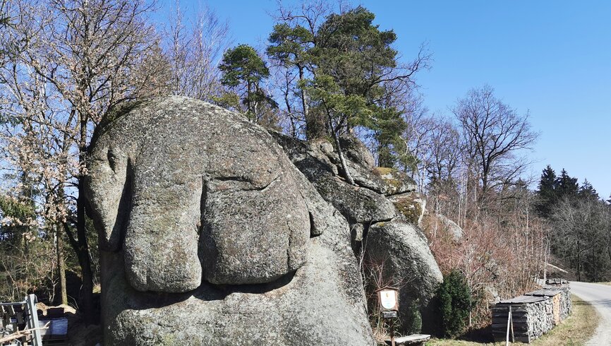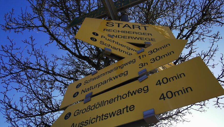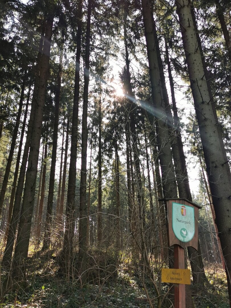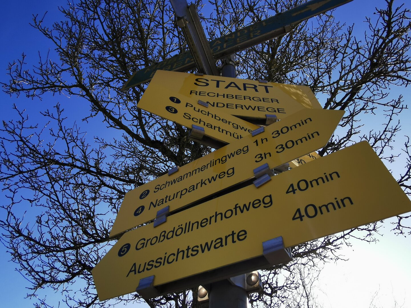 Der großzügige Parkplatz direkt im Zentrum von Rechberg lässt unsere Wanderung entspannt beginnen. Ein „Baum“ an Wegweisern offeriert zahlreiche Alternativen, wir wählen Weg Nr. 4, den „Naturparkweg“. Mit einer Länge von ca. 7km bietet er in einem hügeligen Auf- und Ab das Beste aus der Region: sagenhafte Steinskulpturen und verwunschen-schöne Wälder.