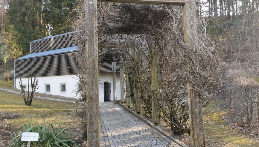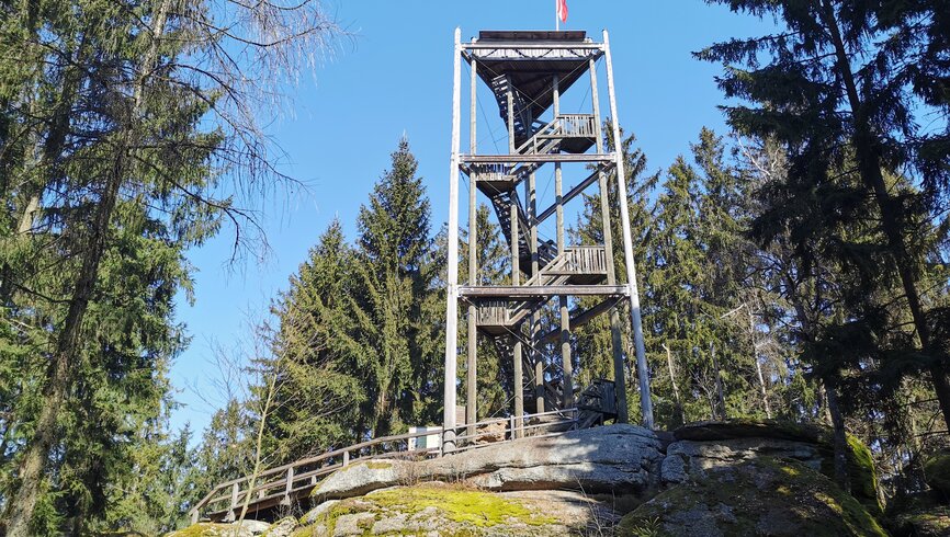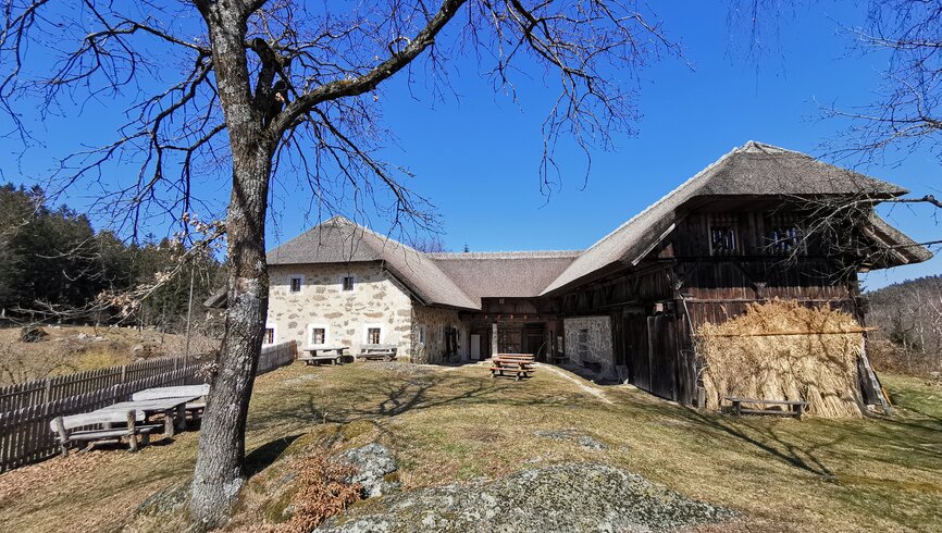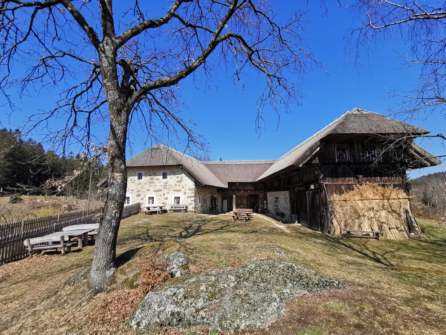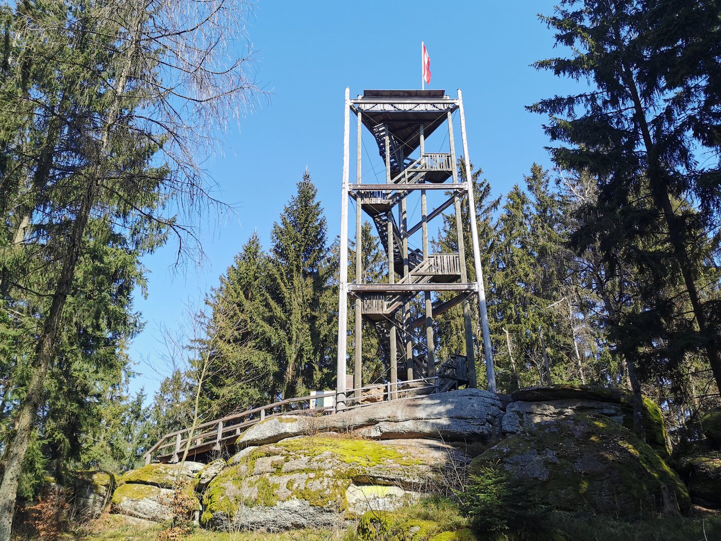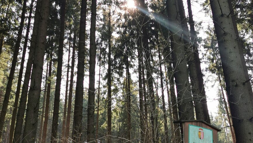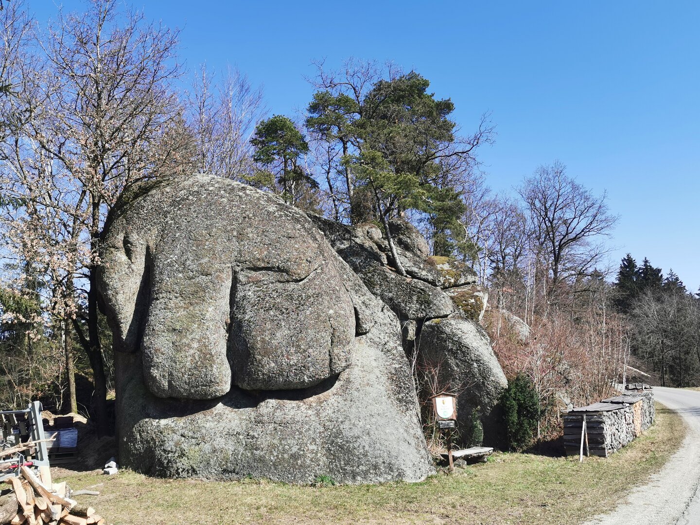 Energiegetankt folgen wir dem weiteren Straßenverlauf bis zur Gabelung – hier gibt es die Möglichkeit links einen 5-Minuten-Abstecher zum Elefantenstein zu machen, was ich Familien mit Kindern ans Herz legen möchte. Rechts an der Gabelung der direkte Rückweg, der zuerst bergab führt, eine Straße kreuzt und danach wieder ansteigt. Am Ende der Straße befinden wir uns auf einer großen Ebene: vor uns der Großdöllnerhof, ein ca. 400jähriges Freiluftmuseum und rechts der Steinlehrpfad mit zahlreichen Exponaten der unterschiedlichen Flyschzone-Gesteinsarten. Dieses Areal ist ein Paradies zum Picknicken, zahlreiche Holz- und originelle Steintische laden zum Verweilen ein. Wir passieren die Jägerkapelle auf unserer rechten Seite und freuen uns auf den beginnenden Waldweg, der uns zu Highlight Nr. 3 bringt: der 1983 errichteten Karl-Weichselbaumer-(Aussichts-)Warte.